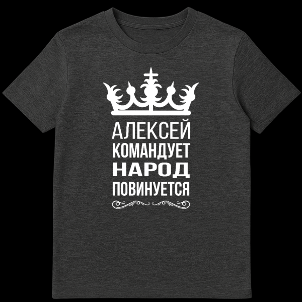 This t-shirt features a striking white stylized crown, followed by bold Cyrillic text that translates to “Alexey Commands, the People Obey.” Below the powerful slogan, a decorative white scrollwork flourish adds a touch of regal elegance. It’s a bold and assertive statement for anyone named Alexey.
