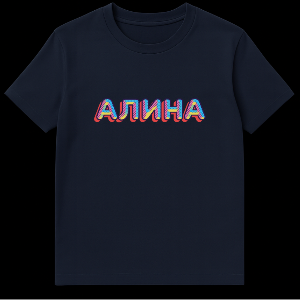 This vibrant Russian T-Shirt features the name “ALINA” in a bold, retro 3D-effect font. Each letter bursts with playful patterns like blue polka dots, pink stripes, and yellow stripes, all highlighted by a striking red drop shadow.