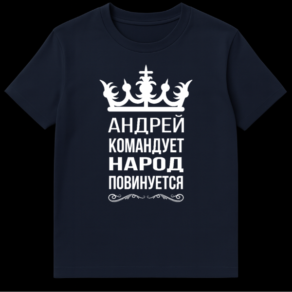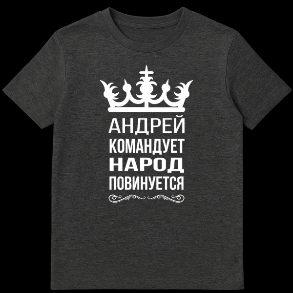 Embrace a powerful and regal aesthetic with this unique t-shirt design. Against a solid grey background, a striking white ornate crown sits proudly at the top, symbolizing authority and leadership. Below it, bold white Cyrillic text proclaims “АНДРЕЙ КОМАНДУЕТ НАРОД ПОВИНУЕТСЯ,” which translates to “Andrey commands, the people obey.” The design is elegantly finished with decorative flourishes at the bottom, enhancing its majestic appeal. This t-shirt exudes a simple, bold, and regal style, perfect for anyone named Andrey who enjoys a bit of playful self-importance or those who appreciate a strong, clear message. It’s a fun, tongue-in-cheek nod to being in charge, making it an excellent conversation starter and a unique gift.