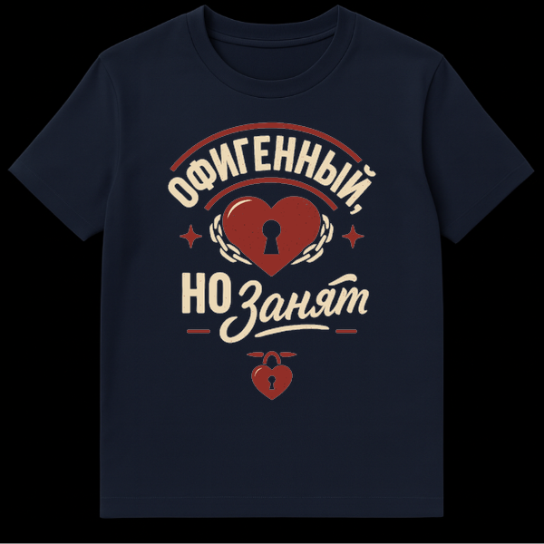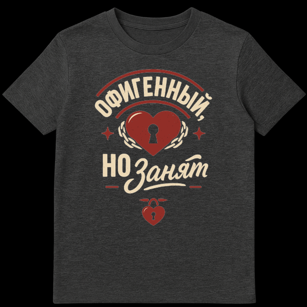 This striking t-shirt features a vintage-distressed red heart with a keyhole, encircled by chains, symbolizing a heart that’s committed. The Russian text, ‘ŠŠ¤ŠŠŠŠŠŠ«Š, ŠŠ ŠŠŠŠÆŠ¢,’ translates to ‘AWESOME, BUT TAKEN,’ conveying a humorous and confident relationship status. A small heart-shaped padlock reinforces the ‘taken’ theme.