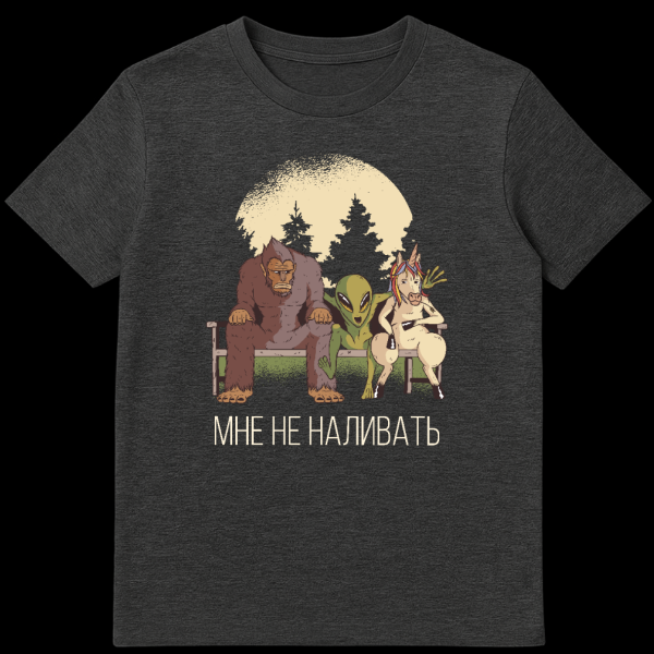 This humorous Russian T-Shirt showcases Bigfoot, an alien, and a unicorn relaxing on a park bench beneath a large moon and pine trees. The unicorn holds a bottle, while the text “MNE NE NALIVAT'” translates to “Don’t pour me a drink.” It’s a whimsical, cartoonish scene of mythical creatures enjoying a casual night out.