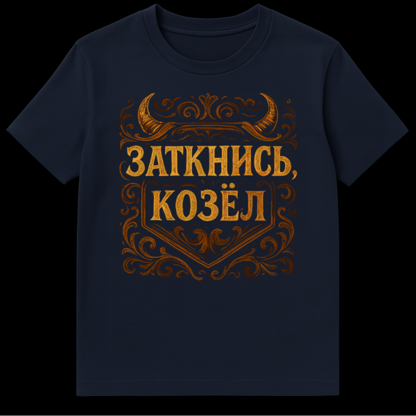 Make a statement without saying a word, or rather, with a very direct one in Russian! This striking t-shirt design showcases the phrase “ŠŠŠ¢ŠŠŠŠ”Ь, ŠŠŠŠŠ” (ZATKNIS, KOZEL) in a bold, distressed gold font. This translates literally to “Shut up, goat,” but in Russian slang, “ŠŗŠ¾Š·ŃŠ»” (kozel) is a common, somewhat aggressive insult equivalent to “asshole” or “jerk.” It’s a playful yet pointed way to express a no-nonsense attitude.