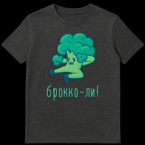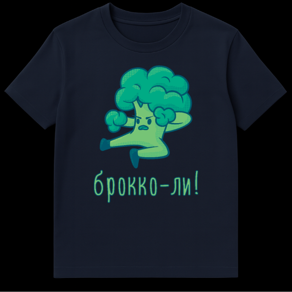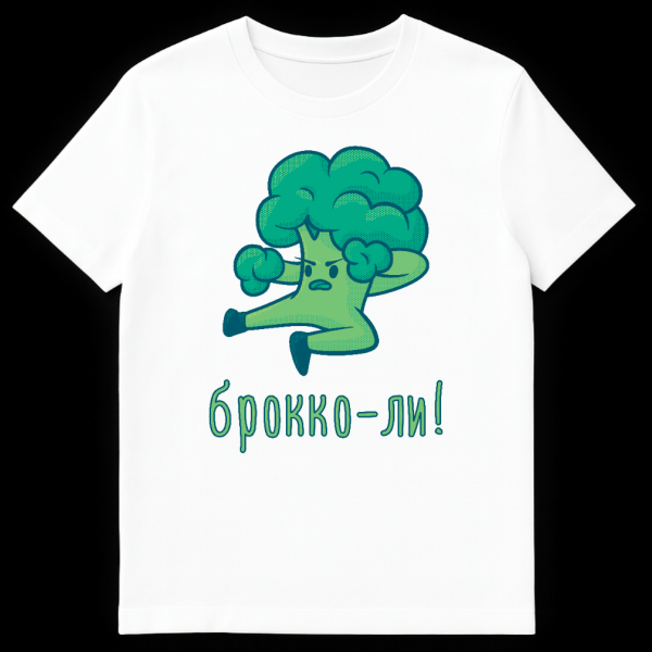 The humor lies in the clever pun: “Brokko-li!” (брокко-ли!) is written in a stylized, outlined green Cyrillic font below the character. This phrase is a playful phonetic twist on “Broccoli” and the iconic martial arts master “Bruce Lee,” creating a humorous fusion of healthy eating and high-kicking action. It’s a fantastic conversation starter, appealing to fans of martial arts, healthy humor, and unique graphic tees.