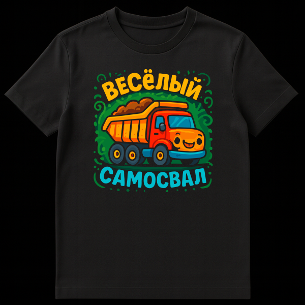 This playful t-shirt features a cheerful, cartoon-style orange and red dump truck carrying brown dirt, set against a vibrant green swirling background. The slogan “VESYOLYY SAMOSVAL” translates to “Merry Dump Truck,” perfectly capturing the fun, childlike theme. It’s a delightful and whimsical design for any young enthusiast.