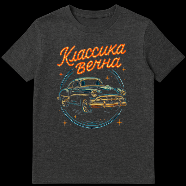 Step back in time with our ‘KLASSIKA VECHNA’ t-shirt, a tribute to vintage automotive culture. The design showcases a sleek, dark blue classic car, elegantly detailed with gold accents, embodying the golden era of automobiles. It’s rendered in a striking retro style, illuminated by the vibrant glow of neon lights, creating a dynamic and nostalgic scene. A luminous blue ring encircles the car, complemented by scattered stars that add to the energetic, dreamlike atmosphere. Above this iconic vehicle, the phrase “ŠŠŠŠ”Š”ŠŠŠ ŠŠŠ§ŠŠ” translates to “CLASSIC IS ETERNAL,” rendered in a brilliant orange neon script. This slogan is a celebration of enduring quality and timeless appeal, resonating with anyone who appreciates the lasting beauty and craftsmanship of classic cars. While not a specific joke, the design itself playfully blends the serious appreciation of vintage vehicles with a fun, retro-futuristic aesthetic, making it a unique statement piece for car enthusiasts and lovers of nostalgic art alike.