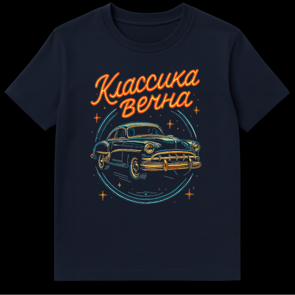 Embrace automotive nostalgia with this vibrant t-shirt featuring a dark blue classic car with gold accents, set against a neon-lit backdrop. Encircling the car is a glowing blue ring and scattered stars, while above, “KLASSIKA VECHNA” (CLASSIC IS ETERNAL) shines in orange neon script. This design captures a timeless appreciation for vintage vehicles with an energetic, retro flair.