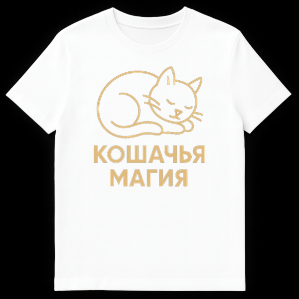 This charming t-shirt features a minimalist, light gold/beige outline of a sleeping cat curled up. Below it, the Russian slogan ‘Koshachya Magiya’ means ‘Cat Magic,’ celebrating the cozy, enchanting aura of felines. It’s a simple, clean, and endearing tribute to cat lovers.
