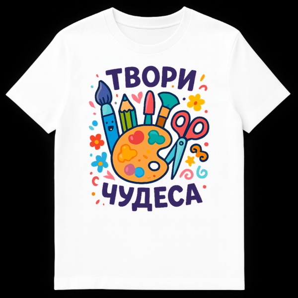 This vibrant t-shirt showcases a cheerful collection of cartoon art supplies, including a smiling paintbrush, palette, pencil, and scissors. The Russian slogan “Š¢Š’ŠžŠ Š˜ ЧУДЕДА” translates to “CREATE MIRACLES,” inspiring artistic endeavors. It’s a playful celebration of creativity and imagination.