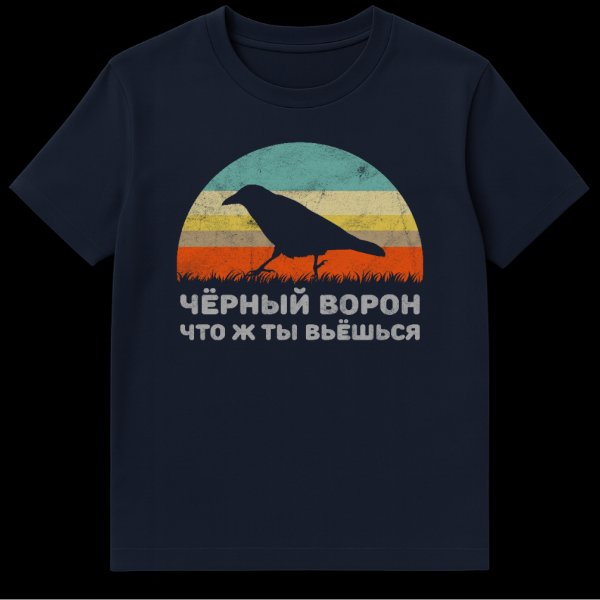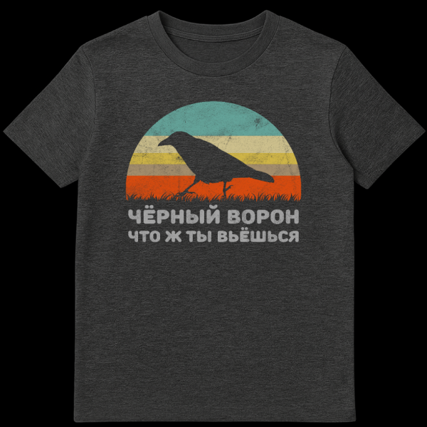 Embrace the mystique of nature and folklore with this unique T-shirt. The design features a prominent, dark silhouette of a crow perched on grass, set against a captivating retro-style striped background. Muted shades of teal, yellow, and orange evoke a serene sunset or sunrise, giving the artwork a timeless, vintage appeal. Below this striking imagery, white Cyrillic text translates to ‘Black Raven, why do you hover’ (ЧЁРНЫЙ ВОРОН ЧТО Ж ТЫ ВЬЁШЬСЯ). This line is a direct quote from ‘Chorny Voron’ (Black Raven), one of Russia’s most famous and beloved folk songs, often associated with military life, farewells, and the poignant themes of fate and longing. The distressed finish adds to its authentic vintage charm, making it feel like a cherished piece of history. This T-shirt is perfect for those who appreciate nature-inspired art, have an interest in Russian culture and language, or simply love a design with a story. It’s a subtle nod to a rich cultural heritage, offering both aesthetic beauty and a touch of lyrical melancholy.