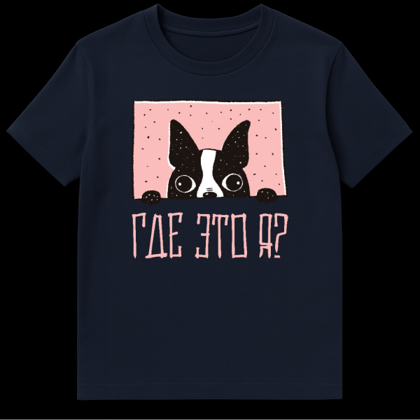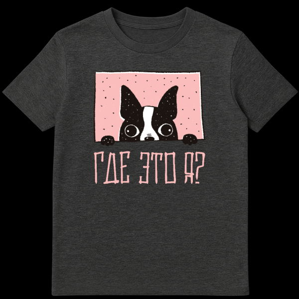 Below the lovable dog, the Russian phrase “ŠŠŠ ŠŠ¢Š ŠÆ?” (GDE ETO YA?) is prominently displayed. This translates directly to “WHERE AM I?”, adding a layer of humor and relatability to the design. The joke lies in the universal feeling of being a bit lost or bewildered, perfectly embodied by the dog’s expression and the accompanying text. It’s a fun and lighthearted way to express a moment of delightful confusion or simply to show off a love for Boston Terriers and a hint of Russian language flair. This design is perfect for dog lovers, those with a quirky sense of humor, or anyone who appreciates unique, conversation-starting apparel.