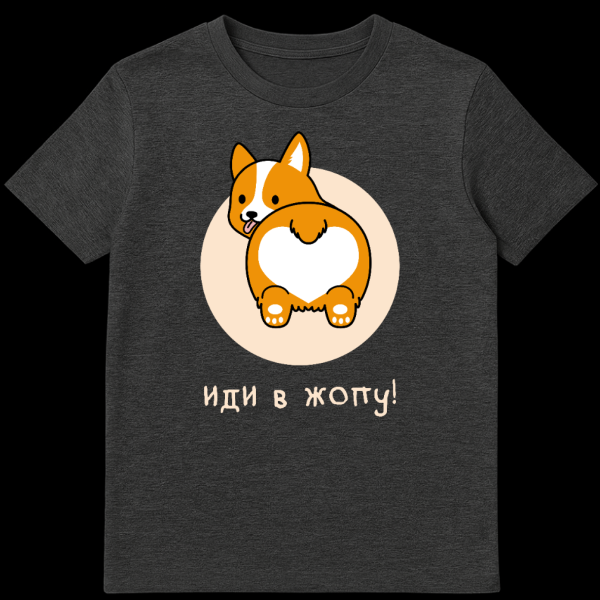 This playful t-shirt features a charming cartoon corgi, back turned, showcasing a sweet heart-shaped white patch on its rear, all set within a vibrant light orange circle. Below this adorable image, the Russian phrase ‘Š˜Š”Š˜ Š’ Š–ŠžŠŸŠ£!’ (Go to hell / Go to ass!) is written in a fun, handwritten style. It’s a humorous and cheeky blend of cute imagery with a surprisingly rude message.