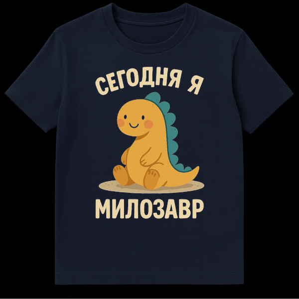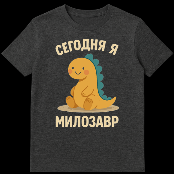 The cream-colored, bold, and slightly distressed font adds a touch of vintage charm to the text. At the top, it reads “СЕГОДНЯ Я” (Segodnya Ya), which translates to “Today I am”. Below, the word “МИЛОЗАВР” (Milozavr) delivers the punchline. This is a brilliant Russian pun, cleverly combining the word “милый” (milyy), meaning ‘cute’ or ‘sweet’, with “динозавр” (dinozavr), meaning ‘dinosaur’. The joke plays on the idea of feeling a bit like an old, perhaps clumsy, but undeniably cute creature – a ‘cute-saur’ if you will. It’s a humorous and relatable statement for anyone who feels a mix of adorable and a little bit ancient. This t-shirt is not just an item of clothing; it’s a conversation starter, a cultural nod, and a warm, fuzzy feeling all rolled into one.