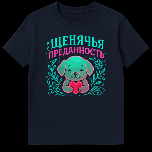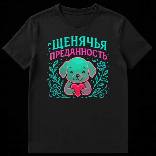 Above this sweet scene, the prominent Cyrillic script reads “ЩЕНЯЧЬЯ ПРЕДАННОСТЬ,” which translates to “PUPPY LOYALTY.” “ЩЕНЯЧЬЯ” is displayed in a matching teal, while “ПРЕДАННОСТЬ” pops in a lovely pink, creating a harmonious and eye-catching color palette. This design embraces a universal theme of loyalty and love, often associated with our canine companions, making it a perfect expression for dog lovers or anyone who values deep connections. The playful yet meaningful slogan adds a touch of cultural flair without being overly complex, making it accessible and appealing.