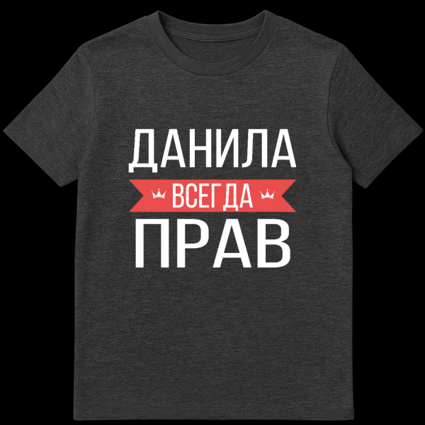 This t-shirt features bold white Russian text on a gray background, highlighted by a central red banner. The slogan ‘ДАНИЛА ВСЕГДА ПРАВ’ translates to ‘Danila is always right,’ with ‘always’ prominently displayed on the banner, flanked by small crown icons. It’s a clean, typographic statement of humorous infallibility.