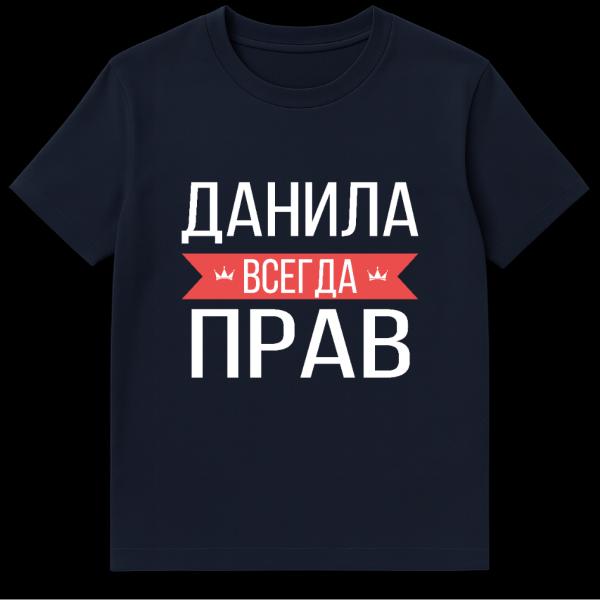 Make a bold, humorous statement with this unique typographic t-shirt. The design features crisp white Russian text on a versatile gray background, ensuring the message stands out. At its core, a vibrant red banner proudly displays the word ‘ВСЕГДА’ (always), flanked by subtle crown icons, adding a touch of playful regality to the declaration. The full slogan, ‘ДАНИЛА ВСЕГДА ПРАВ,’ translates to ‘Danila is always right.’ This shirt is a lighthearted, self-assured proclamation, perfect for anyone named Danila (or who knows one!) who embraces their ‘infallible’ nature with a wink and a smile. The style is clean, modern, and purely typographic, focusing on the powerful message. It’s an engaging piece that sparks conversation and shares a laugh, celebrating a universal inside joke about someone who just can’t be wrong. A fantastic gift or a fun addition to your own wardrobe, blending cultural flair with a touch of personal humor.