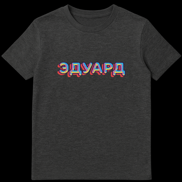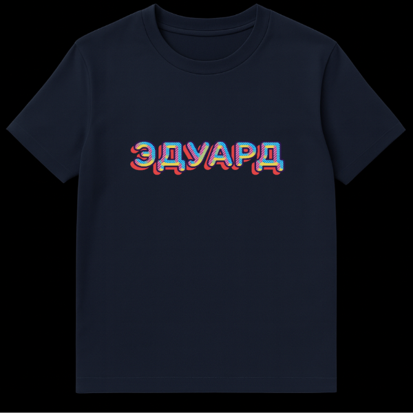 Step out in bold, personalized style with this unique ‘Eduard’ Russian T-Shirt. The design showcases the Russian word “ЭДУАРД” (Eduard) in an eye-catching retro-pop art aesthetic, perfect for those who appreciate vibrant graphics and a touch of individuality. Each letter is meticulously outlined in dark blue, filled with dynamic, alternating patterns of blue halftone dots, playful pink diagonal stripes, and sunny yellow diagonal stripes, creating a truly mesmerizing and colorful visual effect. A striking red drop shadow adds depth, giving the text a cool, three-dimensional appearance that jumps off the fabric. This t-shirt celebrates the name Eduard with a modern, graphic twist, making it an excellent gift for anyone named Eduard or those who simply love unique Russian-themed apparel with a retro flair. There isn’t a hidden joke, rather the appeal lies in the personalized nature and the bold, artistic rendition of the name itself, creating a fun and expressive piece.