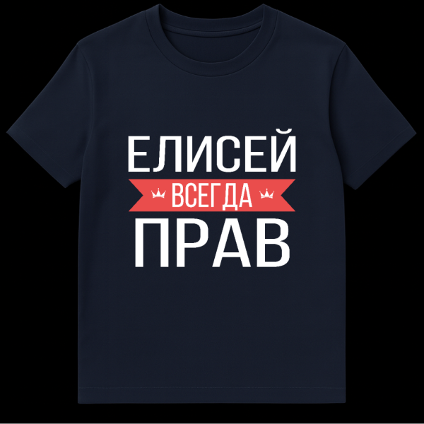 This t-shirt features bold white Russian text ‘ЕЛИСЕЙ ВСЕГДА ПРАВ’ on a gray background. The slogan translates to ‘Elisei is always right,’ with ‘always’ highlighted on a red banner flanked by small crowns. It’s a clean, direct, and humorous statement piece.