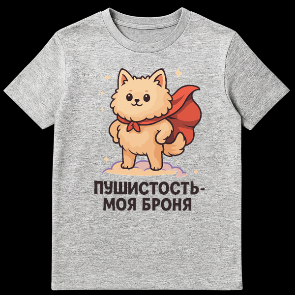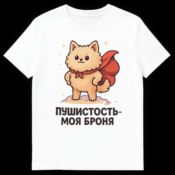 Embrace the whimsical charm of this t-shirt featuring a cute, chibi-like Pomeranian superhero. This adorable light-brown dog wears a red cape, stands on a cloud with sparkling stars, and proudly declares in Russian: “ŠŠ£ŠØŠŠ”Š¢ŠŠ”ТЬ- ŠŠŠÆ ŠŠ ŠŠŠÆ,” meaning “FLUFFINESS IS MY ARMOR.”