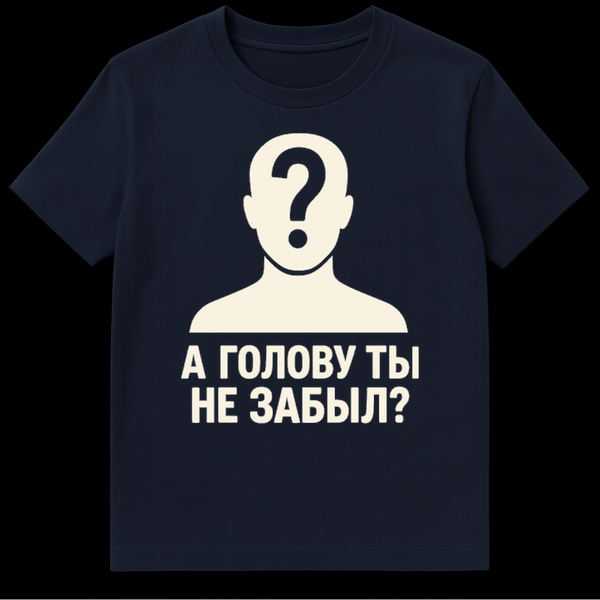 Embrace a blend of humor and minimalist style with this unique t-shirt. The striking graphic features a bold, faceless human silhouette, its head replaced by a prominent question mark, symbolizing a moment of forgetfulness or a lapse in judgment. Below this thought-provoking image, the Russian text “А ГОЛОВУ ТЫ НЕ ЗАБЫЛ?” translates to “And you didn’t forget your head?” – a common, often sarcastic, Russian idiom used to playfully chide someone for being absent-minded or making an obvious mistake. Printed in a clear, blocky off-white/cream font against a classic black background, this t-shirt is simple, direct, and universally appealing to those who appreciate dry wit and a touch of cultural flair. It’s perfect for anyone with a good sense of humor, an interest in Russian culture, or simply a love for clever, understated apparel that sparks conversation.