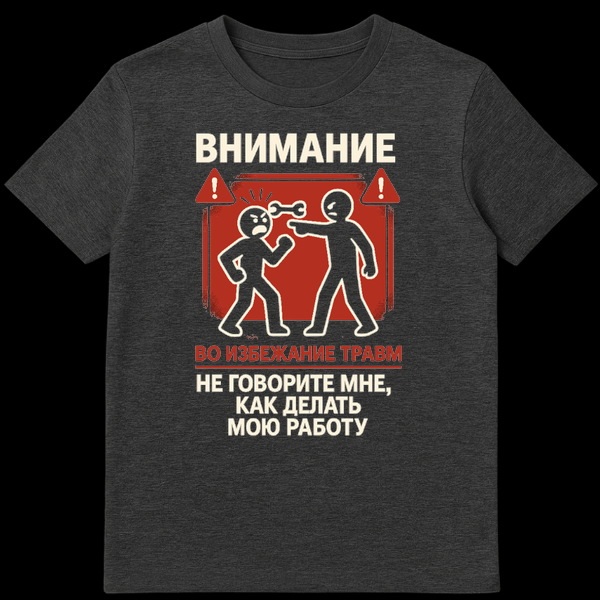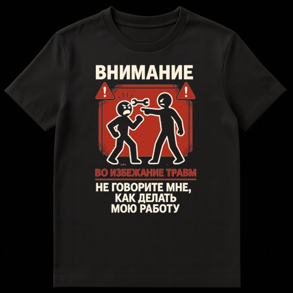 The Russian text, a key element of the design, translates to a universally understood sentiment. The top reads “ŠŠŠŠŠŠŠŠ” (ATTENTION), followed by “ŠŠ ŠŠŠŠŠŠŠŠŠ Š¢Š ŠŠŠ” (TO AVOID INJURY), and finally, the punchline: “ŠŠ ŠŠŠŠŠ ŠŠ¢Š ŠŠŠ, ŠŠŠ ŠŠŠŠŠ¢Š¬ ŠŠŠ® Š ŠŠŠŠ¢Š£” (DON’T TELL ME HOW TO DO MY JOB). This clever juxtaposition of a serious warning sign with a common, relatable frustration creates a genuinely funny and sarcastic piece. It’s a perfect conversation starter for anyone who appreciates a good laugh, values their autonomy, and isn’t afraid to politely (or humorously) push back against unsolicited advice. Ideal for engineers, mechanics, artists, or anyone who takes pride in their craft and enjoys a bit of dry wit.