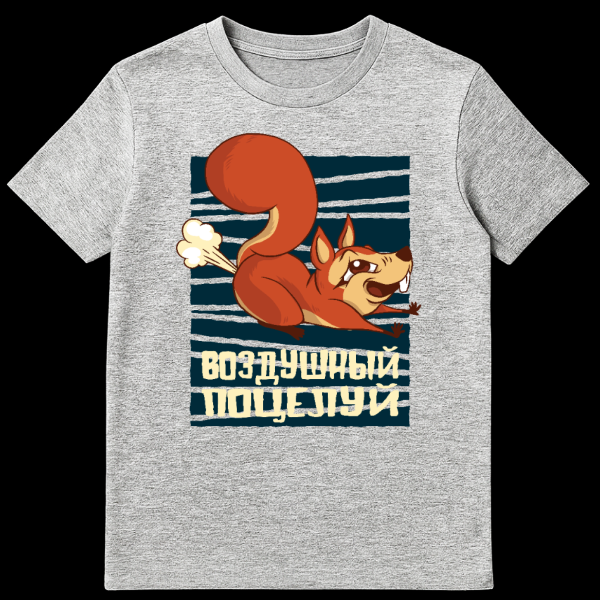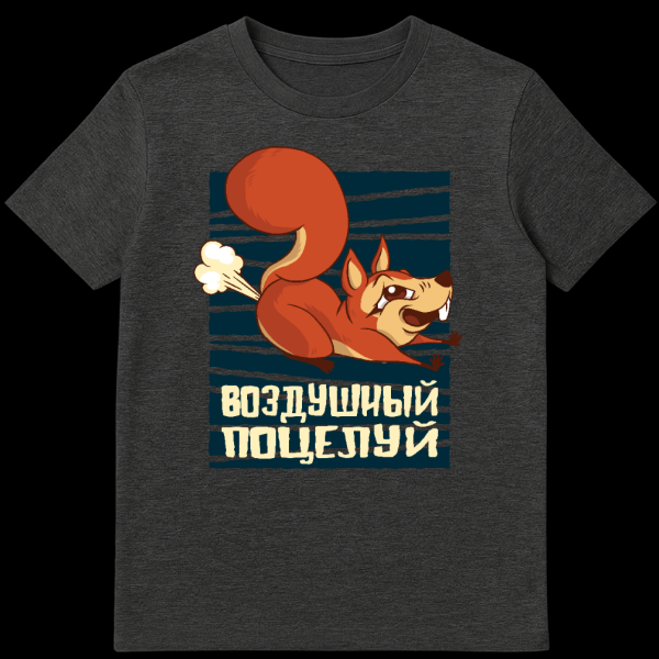 Unleash your playful side with this unique t-shirt featuring a bold, illustrative cartoon squirrel. With a mischievous glint in its eye, this cheeky rodent is depicted comically farting a cloud of smoke, creating an instant visual gag. The humor is further elevated by the Russian text “ŠŠŠŠŠ£ŠØŠŠ«Š ŠŠŠ¦ŠŠŠ£Š” (pronounced: voz-DOOSH-nyy po-tse-LOOY) printed below the illustration, which translates to “AIR KISS”. This juxtaposition creates a clever and unexpected punchline: a seemingly rude act followed by a polite, yet ironic, gesture. It’s a lighthearted jab, perfect for those who appreciate a bit of irreverent humor and enjoy a conversation starter. This design is not just a t-shirt; it’s a statement of fun, wit, and a touch of the unexpected, appealing to anyone with a good sense of humor and an appreciation for unique cultural references.