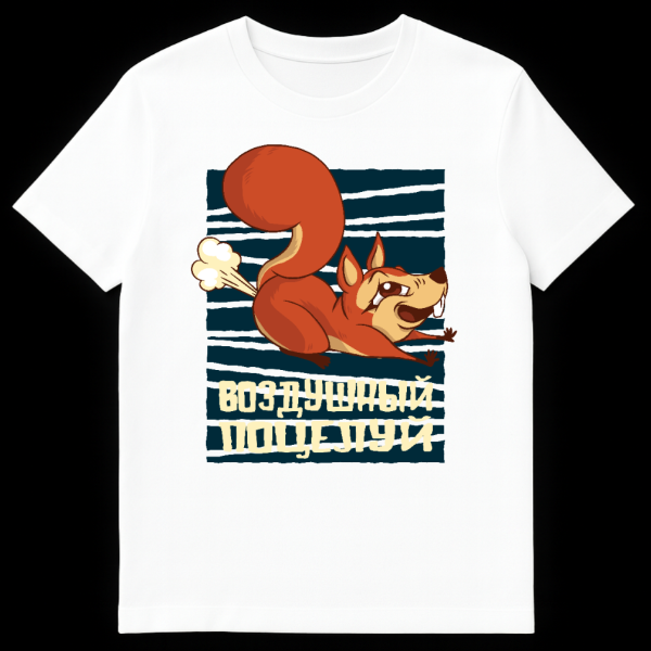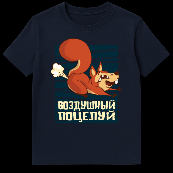 This bold t-shirt features a mischievous cartoon squirrel comically farting a cloud of smoke. Below the humorous illustration, the Russian text “ŠŠŠŠŠ£ŠØŠŠ«Š ŠŠŠ¦ŠŠŠ£Š” translates to “AIR KISS”, adding a cheeky twist. It’s a perfect blend of visual humor and linguistic play.