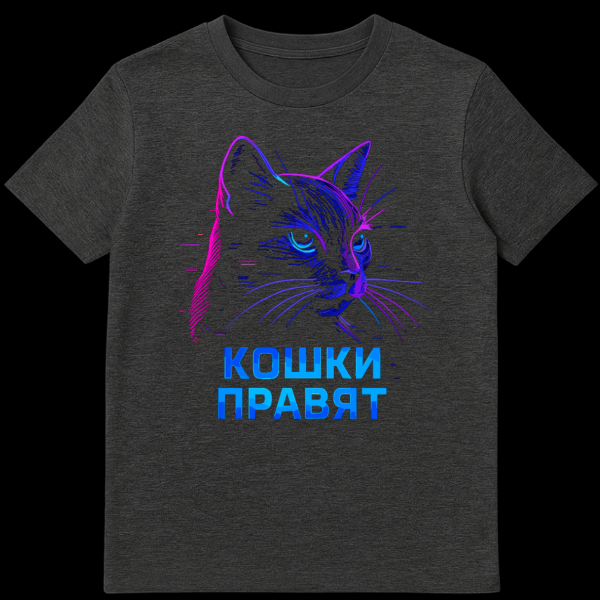 Below this iconic feline, the powerful phrase “ŠŠŠØŠŠ: ŠŠ ŠŠŠÆŠ¢” is emblazoned in a glossy blue, bold font. This Cyrillic text, pronounced “Koshki: Pravyat,” directly translates to “CATS: RULE.” It’s a humorous nod to the universal truth that cats, in their majestic and often aloof manner, truly do govern our hearts and homes. The design perfectly captures the internet’s beloved cat culture, elevated with a sophisticated, edgy style. Whether you’re a cat enthusiast, a fan of vaporwave, or simply love unique graphic tees, this shirt is designed to turn heads and spark conversations.