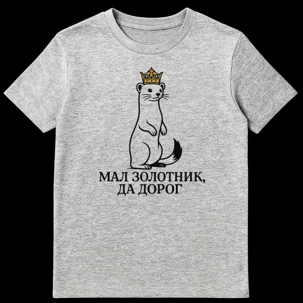 Embrace the charm of understated value with this unique t-shirt featuring a minimalist line-art weasel, a creature often underestimated but full of character. This royal weasel is elevated with elegant golden speckles and a striking golden crown, symbolizing inherent worth and royalty. Below this majestic motif, the Russian text “ŠŠŠ ŠŠŠŠŠ¢ŠŠŠ, ŠŠ ŠŠŠ ŠŠ” (pronounced: Mal zolotnik, da dorog) delivers a profound message. This classic Russian proverb translates to “A small gold coin, but precious” or “A small thing, but valuable.” It’s a celebration of the idea that true worth isn’t determined by size or grandiosity, but by intrinsic quality and significance. The design cleverly plays on the ‘small but mighty’ nature often associated with weasels, reinforcing the proverb’s wisdom. Itās an engaging conversation starter, blending minimalist art with deep cultural meaning, perfect for those who appreciate hidden gems and the power of subtle strength.