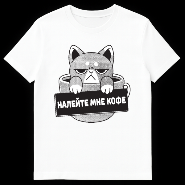 Embrace your inner coffee addict with this uniquely charming t-shirt! The design showcases a wonderfully grumpy, stylized cat, humorously peeking out from a coffee cup. This furball holds a black sign with striking white Russian text, which, when translated, delivers the universally relatable plea: “Pour me coffee.”