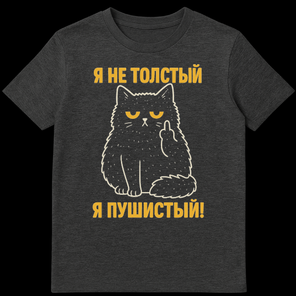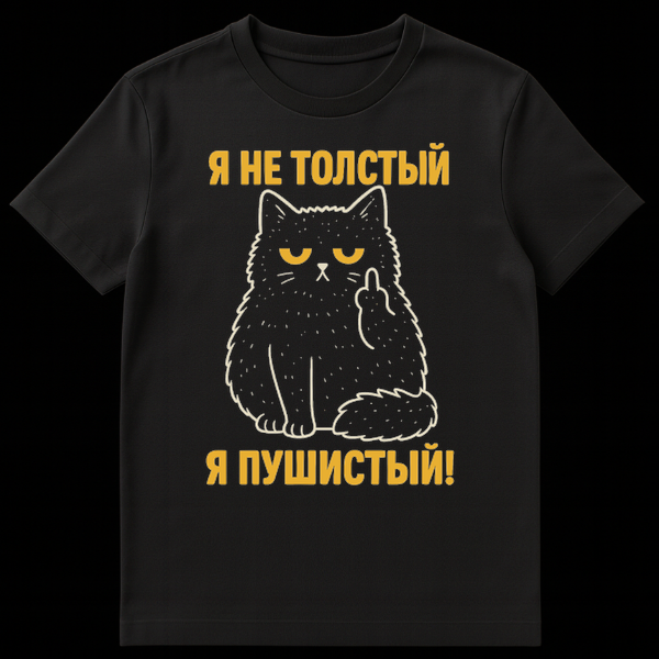 The clever Russian slogan adds another layer of wit. Above the cat, the yellow text reads “ŠÆ ŠŠ• Š¢ŠžŠ›Š”Š¢Š«Š™” (Ya ne tolstyy), which translates to “I’m not fat.” Below the cat, the text continues with “ŠÆ ŠŸŠ£ŠØŠ˜Š”Š¢Š«Š™!” (Ya pushistyy!), meaning “I’m fluffy!” This playful protest against being called ‘fat’ by asserting ‘fluffy’ status is a common, relatable joke, especially among cat owners and those who appreciate self-deprecating humor. It’s a perfect blend of cute animal imagery with a strong, funny, and slightly sassy message, appealing to cat lovers, humor enthusiasts, and anyone who enjoys a bit of defiant charm.