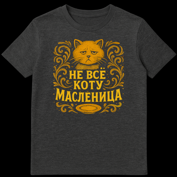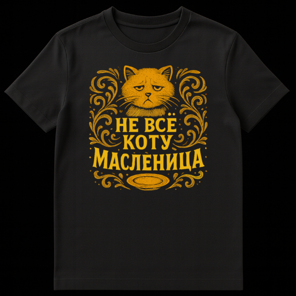 Below the cat, the bold golden Russian text “ŠŠ ŠŠ”Š ŠŠŠ¢Š£ ŠŠŠ”ŠŠŠŠŠ¦Š” is prominently displayed. This translates to “Not all is Maslenitsa for the cat.” Maslenitsa is a joyous Russian folk holiday celebrating the end of winter, known for its rich blini (pancakes) and feasting. The proverb implies that good times and abundance don’t last forever, a sentiment perfectly underscored by the small, empty plate beneath the text. It’s a subtle, witty reminder that life has its ups and downs.