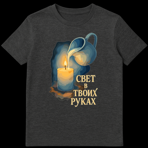 Embrace a message of hope and guidance with this unique illustrative t-shirt. The design features a stylized blue pitcher, elegantly pouring a stream of light directly onto a lit candle, casting a warm, inviting glow that pierces through a dark, layered background. The artistic style is distinctly illustrative, characterized by contoured, almost topographic shading that gives the imagery a tactile, dimensional quality. This piece beautifully embodies themes of light, hope, and guidance, suggesting a source of illumination and comfort. The striking gold Cyrillic text, prominent at the bottom, reads: “Š”ŠŠŠ¢ Š Š¢ŠŠŠŠ„ Š Š£ŠŠŠ„,” which translates to “Light in your hands.” This powerful slogan serves as a cultural reference to empowerment and personal responsibility for creating or holding onto hope and positivity. It’s not just a garment; it’s a wearable piece of art with a profound message, perfect for those who appreciate meaningful symbolism and unique artistic expression. There isn’t a specific joke associated with this design; its appeal lies in its inspirational and artistic nature.