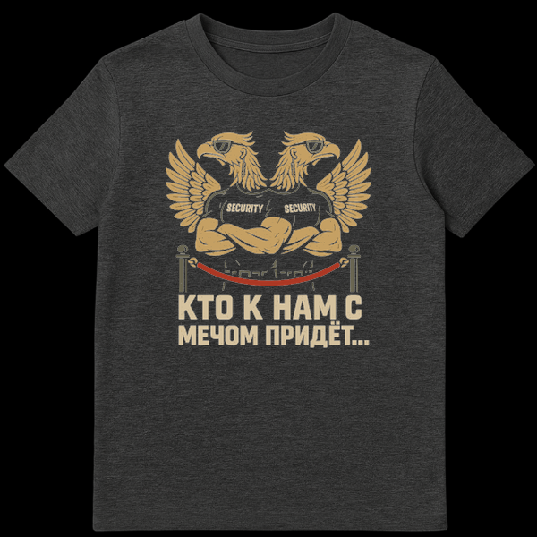Unleash a bold statement with our ‘Russian Security Eagle’ t-shirt, a humorous and assertive take on national protection. This unique design showcases a distressed, cartoonish illustration of Russia’s iconic two-headed eagle, but with a twist: each head is rocking cool sunglasses and an earring, while their muscular bodies are clad in ‘SECURITY’ t-shirts with arms confidently crossed. Below this formidable duo, a plush red velvet rope adds a touch of VIP exclusivity, separating them from the powerful Cyrillic text. The slogan, “КТО К НАМ С МЕЧОМ ПРИДЁТ…” translates to “Whoever comes to us with a sword…” – a well-known Russian proverb that concludes with “…from the sword shall perish.” This design playfully reinterprets the serious concept of national defense, blending traditional symbolism with modern, tough-guy humor. It’s perfect for those who appreciate a strong, witty message and a distinctive, culturally resonant graphic.