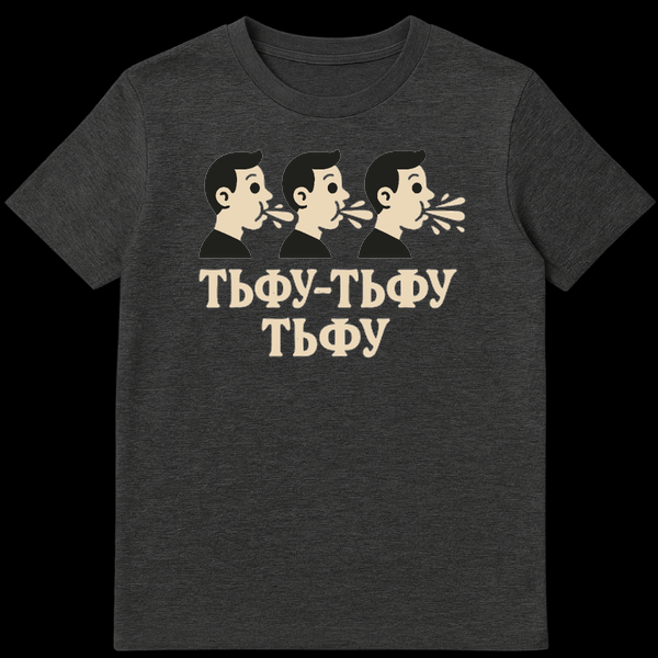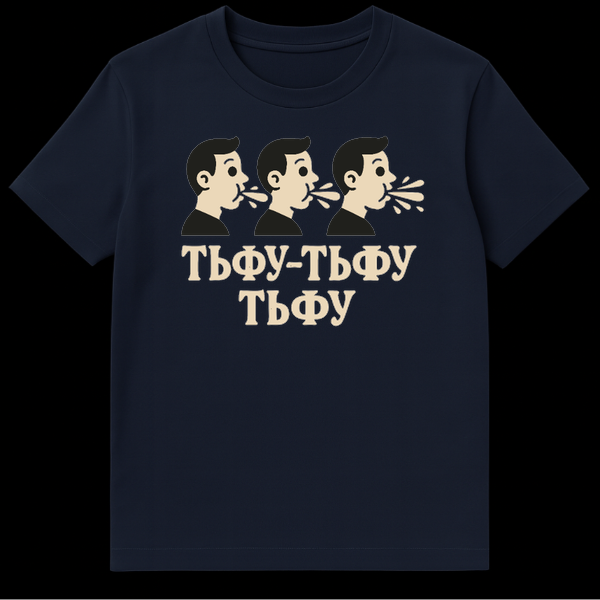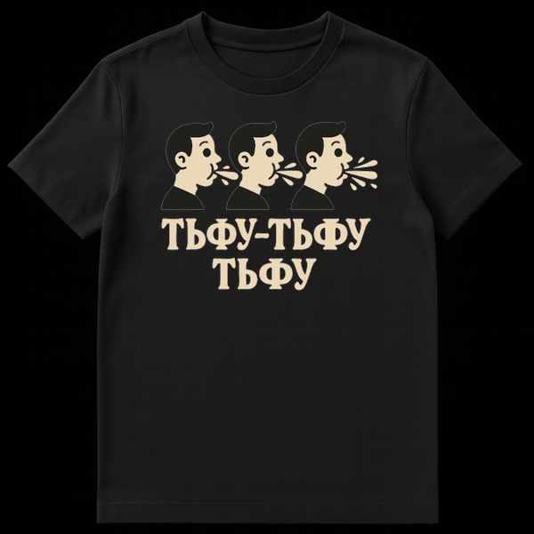Below the spitting trio, the Cyrillic text “ТЬФУ-ТЬФУ” on one line, followed by “ТЬФУ” on a second line, translates to “TFU-TFU, TFU.” This isn’t just a random phrase; it’s an onomatopoeic expression mimicking the sound of spitting, a gesture widely used in Slavic cultures and beyond to ward off evil, bad luck, or the ‘evil eye.’ It’s often done playfully or mock-seriously, especially after complimenting someone or hearing something that might tempt fate.