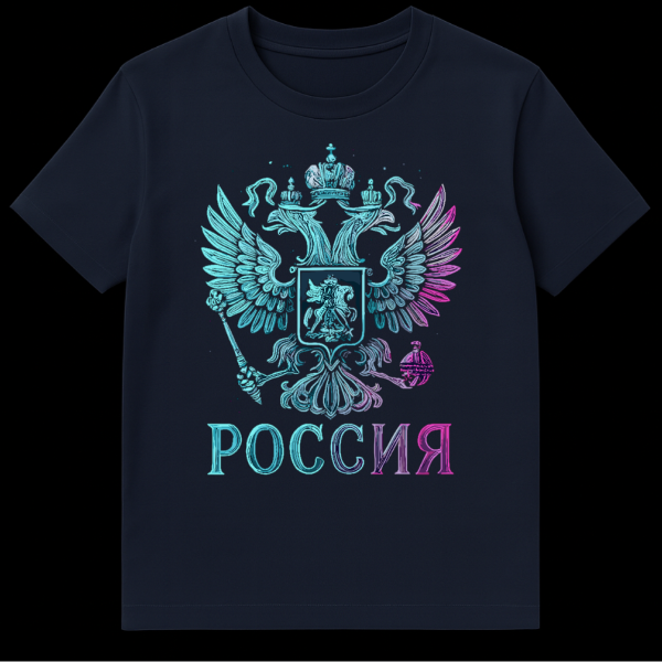 Beneath this magnificent emblem, the word “Š ŠŠ”Š”ŠŠÆ” (pronounced ‘Rossiya’), which means ‘Russia’ in English, is proudly displayed. It mirrors the same dynamic teal-to-magenta gradient, creating a cohesive and visually stunning look. This t-shirt is designed for those who appreciate a modern, edgy style while celebrating their Russian heritage or admiration for the culture. It’s an engaging and informative piece that blends historical symbolism with a fresh, artistic approach.