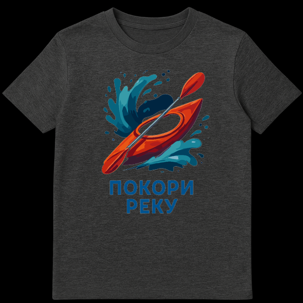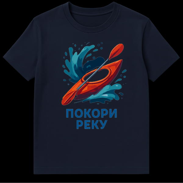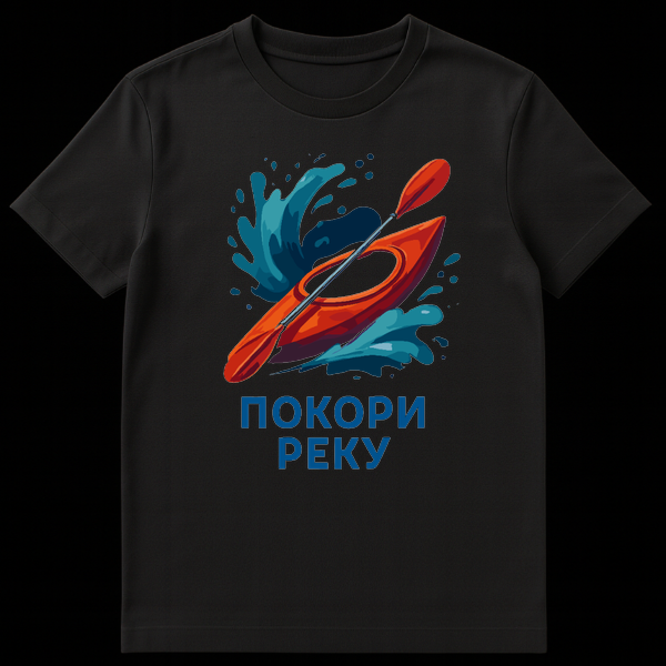 Embrace the spirit of adventure with our ‘Conquer the River’ T-Shirt, showcasing a bold and graphic design. The centerpiece is a stylized orange kayak, complete with a paddle, dynamically surrounded by energetic blue water splashes, all set against a deep black background for maximum contrast. This design captures the thrill and motion of kayaking and water sports. The impactful blue text “ŠŠŠŠŠ Š Š ŠŠŠ£” is prominently displayed below the graphic. This phrase, translating from Russian as “Conquer the River,” serves as a motivational slogan, appealing to those who love to challenge themselves and connect with nature through water activities. The style is modern, graphic, and highly appealing to anyone with a passion for the outdoors and a bold aesthetic. There is no hidden joke, only a direct and empowering message for adventurers.