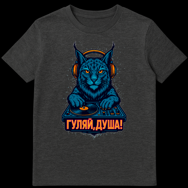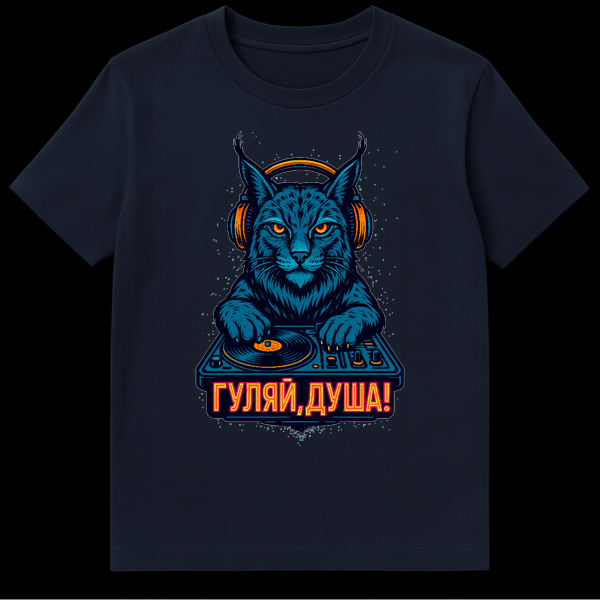 Unleash your inner party animal with this vibrant t-shirt featuring a stylized lynx DJ. Sporting orange headphones and glowing eyes, it spins tracks on a turntable against a dark, speckle-lit background. Below, the bold Cyrillic text “ГУЛЯЙ,ДУША!” translates to “GULYAI, DUSHA!” meaning “Party, Soul!” or “Let Loose, Soul!”, perfectly capturing a carefree, celebratory vibe.