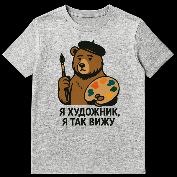 This cartoonish t-shirt features a brown bear in a beret, holding a paintbrush and palette, with a sad expression. The Russian text “ŠÆ Ń ŃŠ“ожник, Ń ŃŠ°Šŗ вижє translates to “I am an artist, I see it this way.” It’s a whimsical nod to artistic perspective.