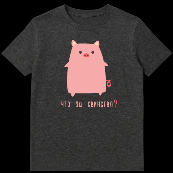 Embrace a playful blend of cuteness and wit with this unique t-shirt. It showcases a lovable, minimalist pink pig illustration, complete with small black eyes and a perfectly pink snout, all rendered in a simple, cartoonish style against a solid gray background. The pig stands proudly above the Russian text “Š§Š¢Šž ЗА Š”Š’Š˜ŠŠ”Š¢Š’Šž?” (CHTO ZA SVINSTVO?), which directly translates to “What kind of piggishness?” or more idiomatically, “What a mess?” or “What a disgrace?”. This phrase cleverly uses the word “свинство” (svinstvo), derived from “ŃŠ²ŠøŠ½ŃŒŃ” (svinya), meaning “pig,” to denote a messy, unkempt, or unruly situation. It’s a common, humorous, and expressive Russian idiom used when encountering something untidy, rude, or generally unacceptable. Perfect for those who appreciate simple, charming illustrations, a touch of Russian culture, and a good-natured, relatable joke about life’s little messes. This shirt is sure to bring a smile and spark conversations.
