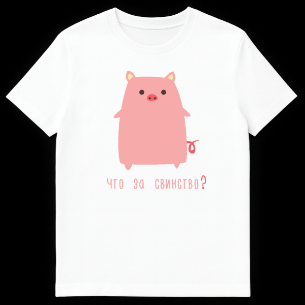 This charming t-shirt features a cute, minimalist pink pig with tiny black eyes and a matching pink snout. Below the adorable swine, the Russian text “CHTO ZA SVINSTVO?” translates to “What kind of piggishness?” or “What a mess!” It’s a humorous and stylish way to express a relatable sentiment.
