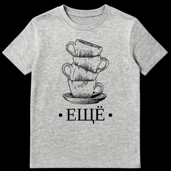 Below this artful stack, the Russian word “ЕЩЁ” (pronounced “yesh-CHYO”) is prominently displayed in a classic serif font, flanked by subtle dots. “ЕЩЁ” translates to “more” or “still,” encapsulating that universal feeling of needing just one more cup to start the day, power through an afternoon, or simply savor the moment. It’s a playful nod to the endless desire for your favorite brew, making it a perfect conversation starter for coffee aficionados, tea lovers, and those with an appreciation for Russian language and culture. This shirt is a subtle, humorous statement for anyone who knows that one cup is rarely enough.