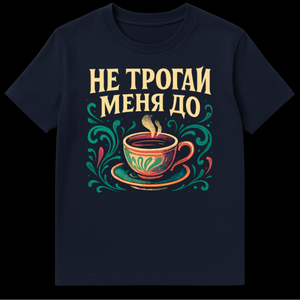 This vibrant t-shirt features a stylized, colorful coffee cup emitting steam, framed by whimsical decorative swirls in a folksy, illustrative style. It playfully warns of morning grumpiness with the Russian slogan “НЕ ТРОГАЙ МЕНЯ ДО” which translates to “Do not touch me until”. A perfect statement for anyone who needs their morning brew before engaging with the world.