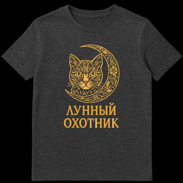 Completing the design is the gold Russian text ‘ŠŠ£ŠŠŠ«Š ŠŠ„ŠŠ¢ŠŠŠ,’ which translates to ‘LUNNYY OKHOTNIK’ in English, meaning ‘Moon Hunter.’ This slogan perfectly encapsulates the mystical, nocturnal essence of the design, appealing to lovers of fantasy, unique cultural references, and feline aesthetics. It’s a perfect blend of artistic detail and intriguing narrative, making it more than just a garment ā it’s a statement piece.