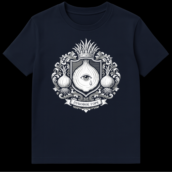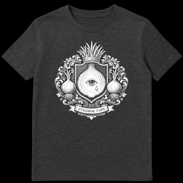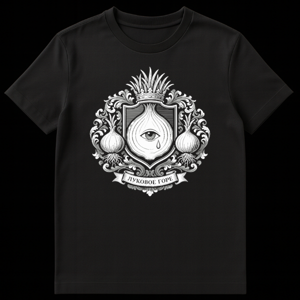 Embrace a blend of classical artistry and whimsical humor with our ‘Onion Grief’ Russian T-Shirt. This striking monochrome design features an ornate heraldic crest, meticulously detailed in the style of a classical engraving. At its heart lies a central shield, uniquely emblazoned with a crying onion, complete with a single tearful eye, crowned by a regal crown and leafy sprouts. Two smaller, rooted onions flank the shield, all encased within an elaborate swirl of foliage that evokes a sense of timeless elegance.