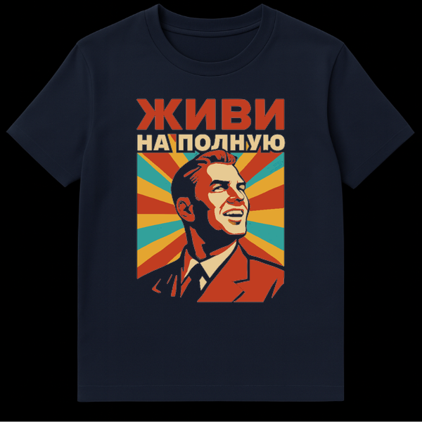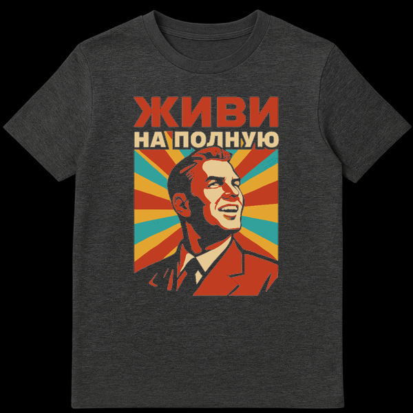 Above the portrait, the Russian text “ŠŠŠŠ ŠŠ ŠŠŠŠŠ£Š®” commands attention. This phrase, pronounced “Zhivy na polnuyu,” translates powerfully to “Live Life to the Fullest” or “Live to the Max.” It’s a universal call to embrace every moment, pursue dreams, and live without regret. This t-shirt isn’t just clothing; it’s a statement, a reminder to seize the day and approach life with enthusiasm. It’s perfect for those who appreciate unique graphic tees, enjoy a touch of retro style, or simply want to spread a positive message wherever they go. While there isn’t a specific ‘joke’ in the design, its unexpected blend of a propaganda-inspired aesthetic with a purely optimistic, non-political message creates an intriguing and thought-provoking contrast, making it a conversation starter.