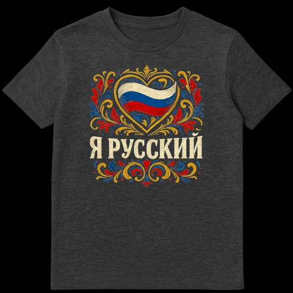 Embrace and celebrate Russian heritage with this uniquely designed patriotic t-shirt. The centerpiece is a vibrant, heart-shaped Russian flag, symbolizing love for one’s homeland. This patriotic emblem is beautifully encircled by intricate, colorful floral and scrollwork patterns, rendered in a traditional folk art style reminiscent of classic Russian decorative arts. The rich details and bright hues evoke a sense of cultural depth and craftsmanship.