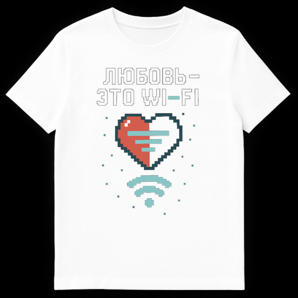 Dive into a world where romance meets retro tech with this unique pixel art t-shirt. The design showcases a striking split heart, rendered in vibrant red and dark teal, flanked by light blue horizontal bars that cleverly mimic a digital signal strength indicator. Below this central motif, a crisp light blue Wi-Fi symbol is depicted, surrounded by an array of small, square ‘signal’ particles, reinforcing the theme of connectivity. Above the entire graphic, the pixelated outline text boldly declares “ŠŠ®ŠŠŠŠ¬ ā ŠŠ¢Š WI-FI”, which translates to “LOVE ā THIS IS WI-FI”. This playful slogan forms the core of the design’s humor, drawing a witty parallel between the essential, pervasive nature of love and the ubiquitous presence of Wi-Fi in modern life. It’s a clever cultural reference, a modern proverb for the digital age, presented through a charming 8-bit aesthetic that evokes nostalgia for classic video games and early digital graphics. Perfect for tech enthusiasts, romantics with a sense of humor, or anyone who appreciates a blend of retro style and contemporary wit.