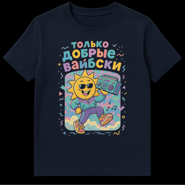 Rock a retro vibe with this vibrant t-shirt featuring a cheerful, sunglasses-wearing sun character in an 80s/90s tracksuit, grooving with a boombox inside a pastel geometric frame. The slogan “Š¢ŠžŠ›Š¬ŠšŠž Š”ŠžŠ‘Š Š«Š• Š’ŠŠ™Š‘Š”ŠšŠ˜” translates to “Only Good Vibes,” spreading positivity wherever you go. This cartoonish and upbeat design is a nostalgic trip.
