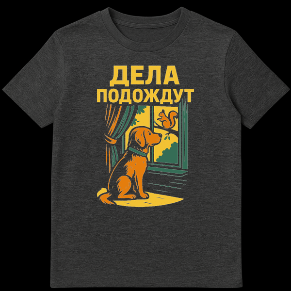The underlying theme is one of relaxation and gentle procrastination, playfully emphasized by the Russian text “ŠŠŠŠ ŠŠŠŠŠŠŠ£Š¢” (pronounced DELA PODOZHDUT). This phrase translates to “Things can wait” or “Business can wait,” a universal sentiment for anyone who’s ever found themselves happily distracted from their to-do list. Itās a humorous nod to the joy of simple pleasures and the art of putting off tasks for a more appealing activity, like watching a squirrel. This t-shirt is perfect for dog lovers, fans of retro art, or anyone who appreciates a witty, culturally rich statement about taking life at a slower pace.