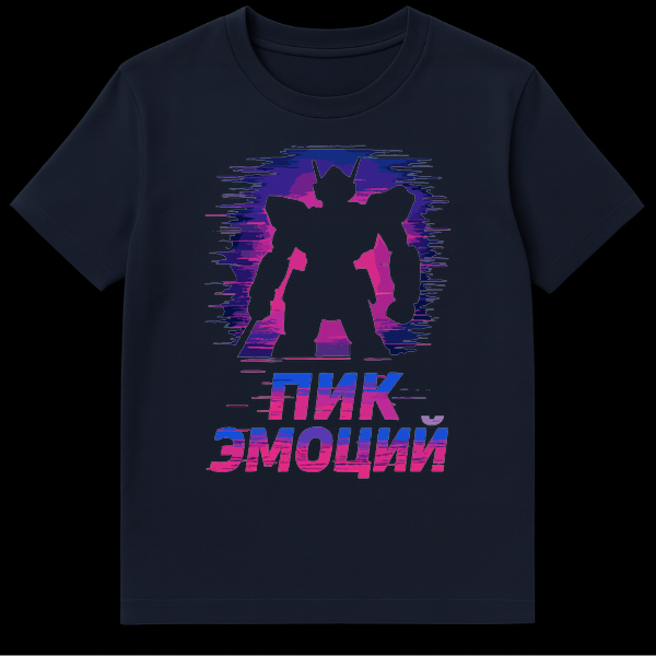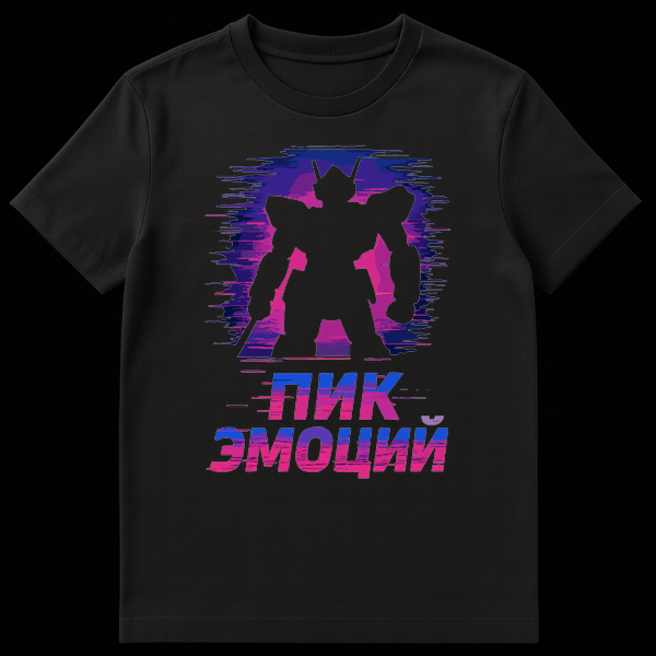 Dive into a world where 80s synthwave meets futuristic anime with our ‘Peak Emotions’ t-shirt. This striking design showcases a bold black silhouette of a large, humanoid robot (mecha) standing prominently against a mesmerizing glitch-art background. The backdrop explodes with a vibrant spectrum of pink, purple, and blue hues, meticulously crafted to resemble a digital sunset or sunrise, instantly transporting you to a retro-futuristic landscape. The aesthetic is deeply rooted in vaporwave and outrun visuals, perfect for fans of sci-fi and nostalgic tech. Below this powerful mecha, two lines of Cyrillic text, “ŠŠŠ ŠŠŠŠ¦ŠŠ,” translate to “PEAK EMOTIONS.” This slogan is rendered in a unique, horizontally stretched, pixelated gradient style, with the top line predominantly pink/purple and the bottom line blue/purple. The ‘joke’ or appeal lies in the unexpected pairing of a powerful mecha with an evocative, almost poetic, Russian phrase that captures the intensity of the visual experience. It’s a statement piece that blends cultural references with an iconic visual identity, celebrating the golden age of arcade graphics and synth music.